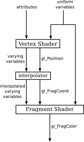 A varying variable should be declared in both shaders, with the same name and type. This allows the GLSL compiler to determine what attribute, uniform, and varying variables are used in a shader program. For example given a set of vertices we may want to use the interpolated colour for a given pixel and therefore we would use a varying variable.